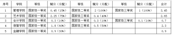 综合考核文件规定,获得中国国际大学生创新大赛国赛金奖得3分,获中国国际大学生创新大赛国赛银奖、国赛铜奖分别得2分/项、1分/项。结合大赛参与及指导实际情况,研究确定以下具体赋分规则:
