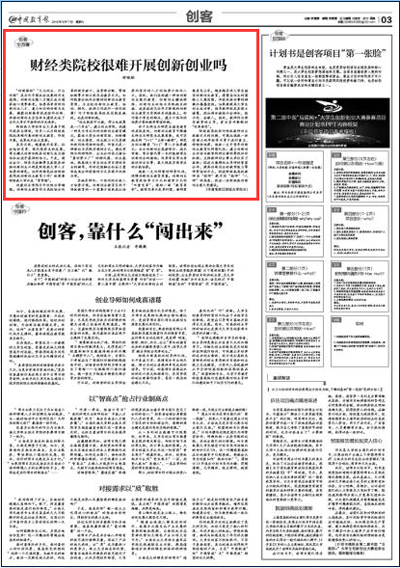 9月17日,《中国产视频 育报》第3版大篇幅刊登钟晓敏校长撰写的题为《财经类院校很难开展创新创业吗》的文章。