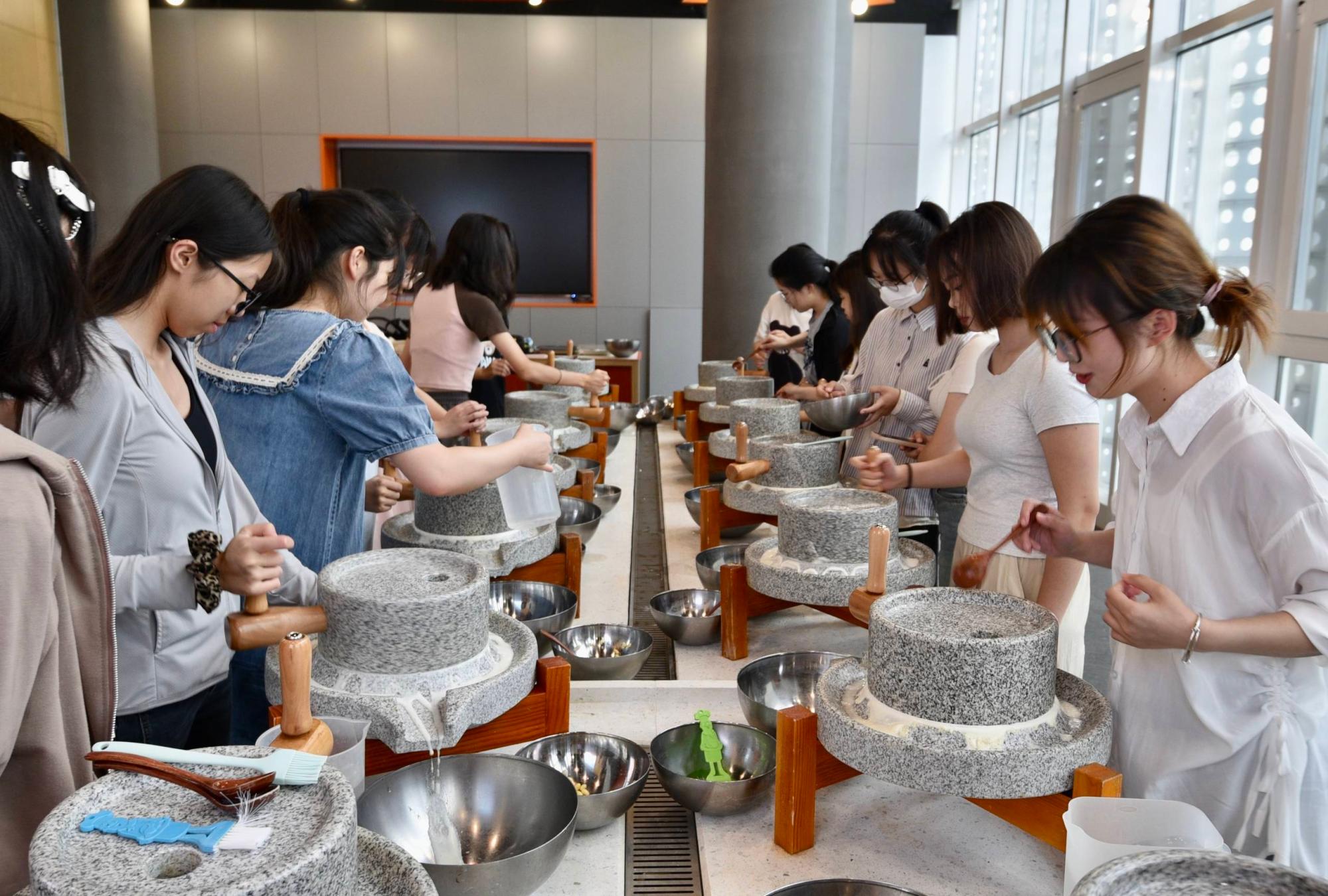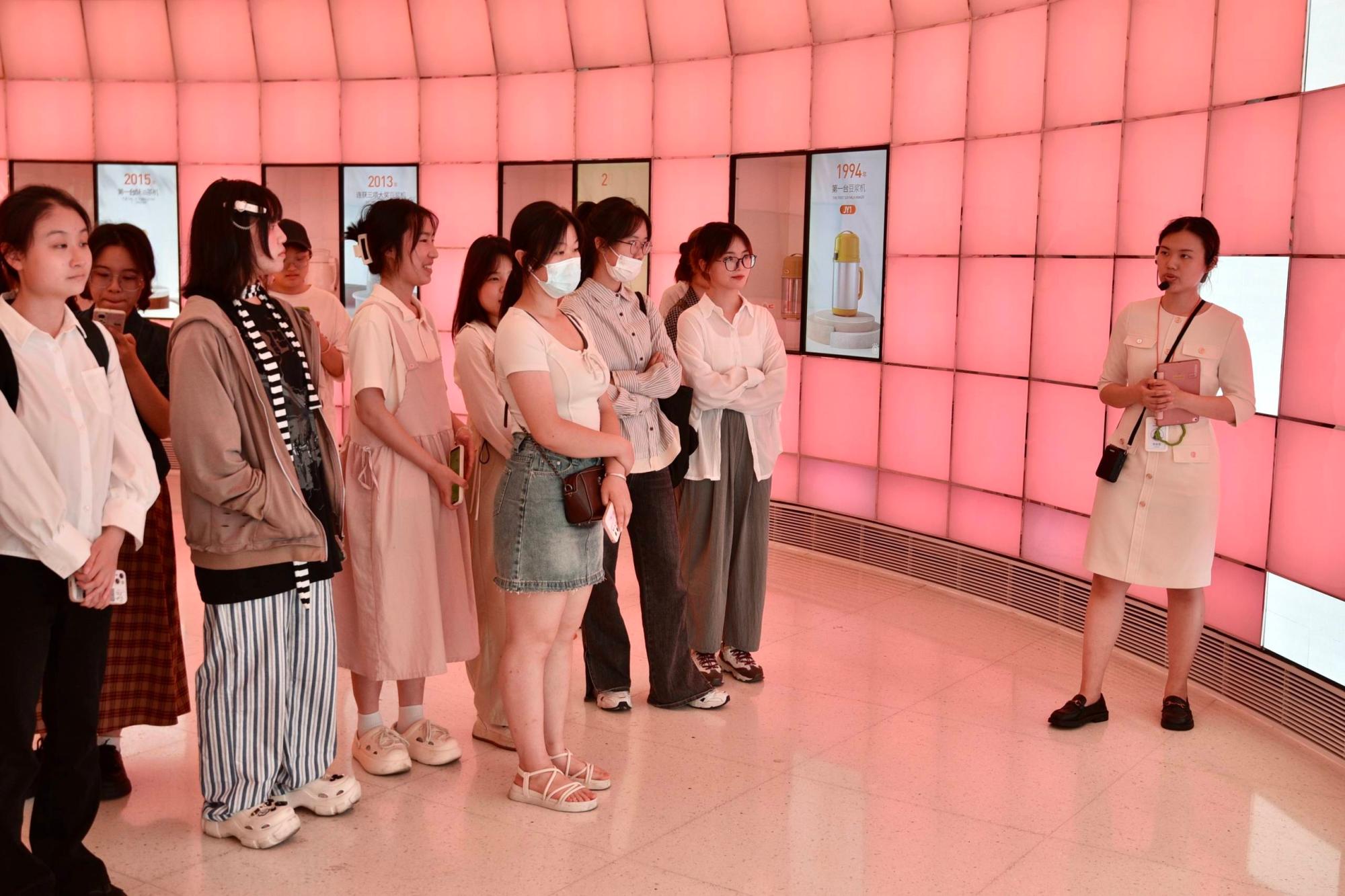首先,讲解员带领同学们来到九阳品牌体验馆,品尝了豆浆,学习了了九阳企业的发展史,并自己动手体验了手磨豆浆。在讲解员娓娓道来的讲述中,九阳的品牌历史、创新理念给同学们留下了愈发深刻的印象。