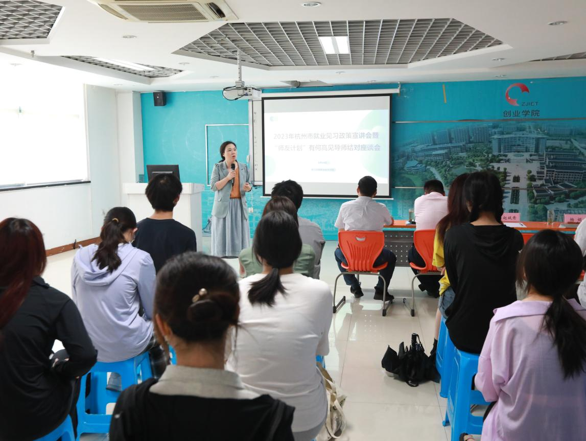 举办“公共服务进校园”2023年杭州市就业见习政策宣讲会暨“师友计划”有何高见导师结对座谈会。
