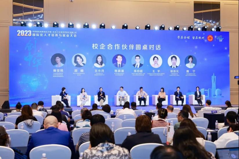 本次大会特设校企合作伙伴圆桌对话环节,杭州市侨联副主席、杭州市留联会会长、新通教育集团董事长麻亚炜作为圆桌主持人,同高校代表浙江大学就业指导中心副主任邵頔、华中科技大学外国语国产视频