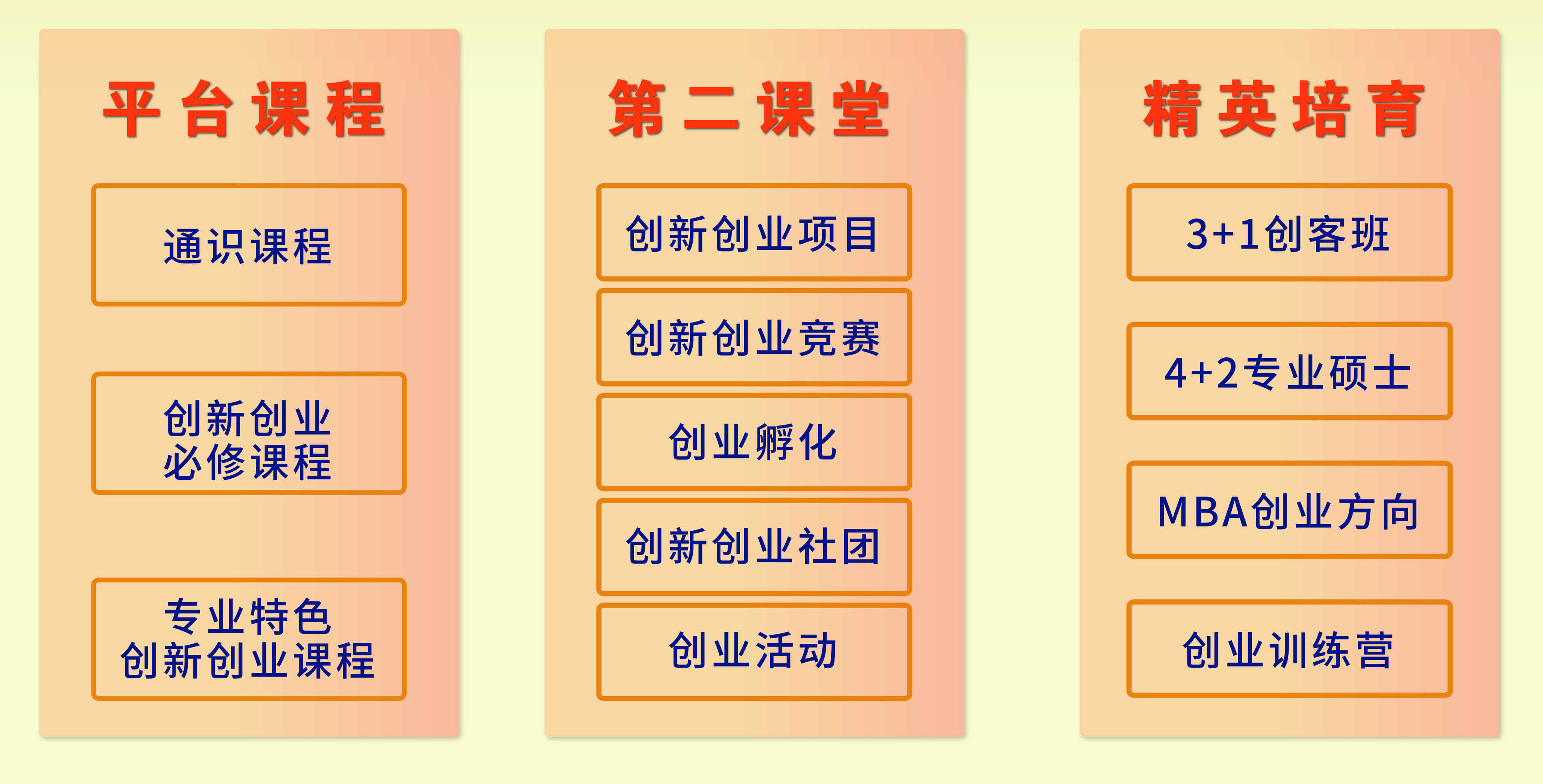 精英培育是选拔具有良好创业特质的在校生,组建创业精英班,经过系统化创业专业教育,通过整合各方资源,直接推动相应创业项目的孵化和运营。