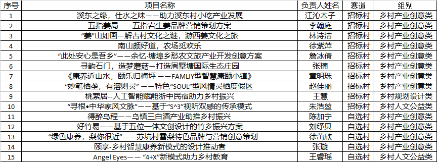 根据本年度国产视频 乡村振兴创意大赛选拔赛相关规定,经项目立项、外送盲审等流程,在178项优秀项目中选拔出主赛道招标村10项、自选村5项推荐入围省赛复赛,具体名单如下: