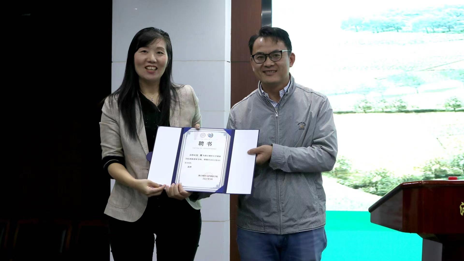 副院长吴诗启老师为向珊女士颁发创业导师聘书。