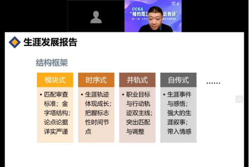 最后,刘海滨结合以往参赛作品案例分析优点和不足,并提供了生涯发展报告的一些结构框架。此外,他在互动区线上交流,有效地解答了师生在备赛过程中的困惑。