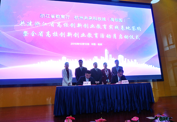 10月10日,浙江省教育厅与杭州未来科技城(海创园)共建浙江省高校创新创业教育实践基地签约暨全省高校创新创业教育活动月启动仪式在梦想小镇举行。