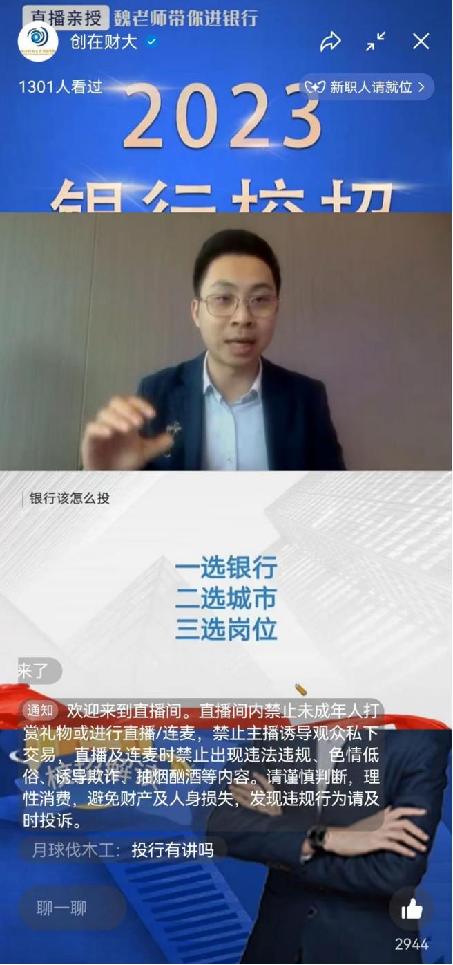 举办,绘梦蓝创空间承办的2023银行校招通关解读讲座在创在财大视频号顺利举行。为了大四应届生能够更好地应聘,激发低年级同学提前规划就业创业的积极性,国产视频