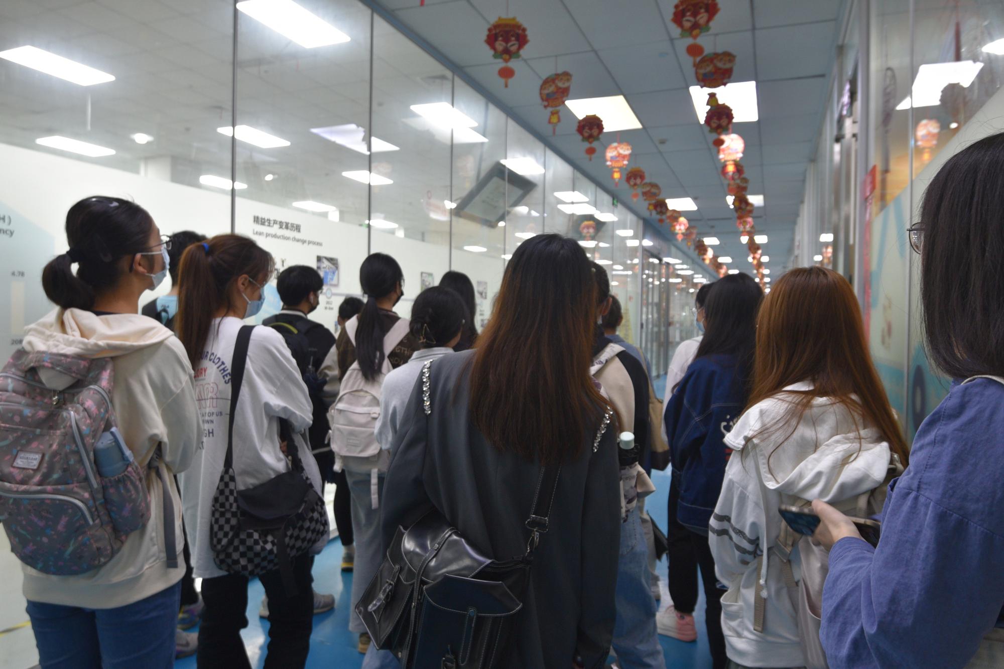 同学们第一站来到的是九阳智造车间,第一次近距离接触生产流水线的同学们经工作人员介绍和全方位的参观之后,都为九阳企业智能化水平所震撼:流水线现多已投入自动化、规模化的机器实现自动精度检测。未来九阳还将采用“智能定位运输机器”新模式,为实现工位集约化和人工效率优化等问题提供更加优质的解决方案。
