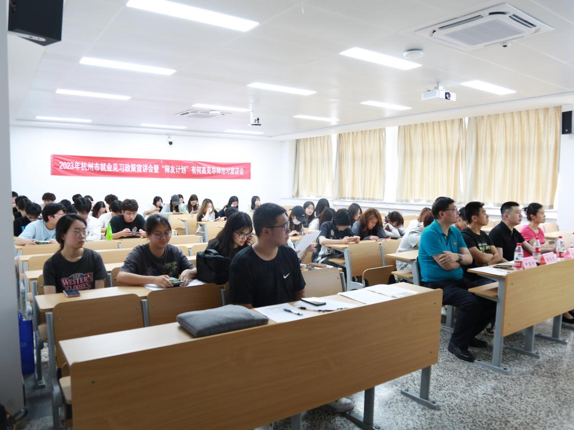举办“公共服务进校园”2023年杭州市就业见习政策宣讲会暨“师友计划”有何高见导师结对座谈会。