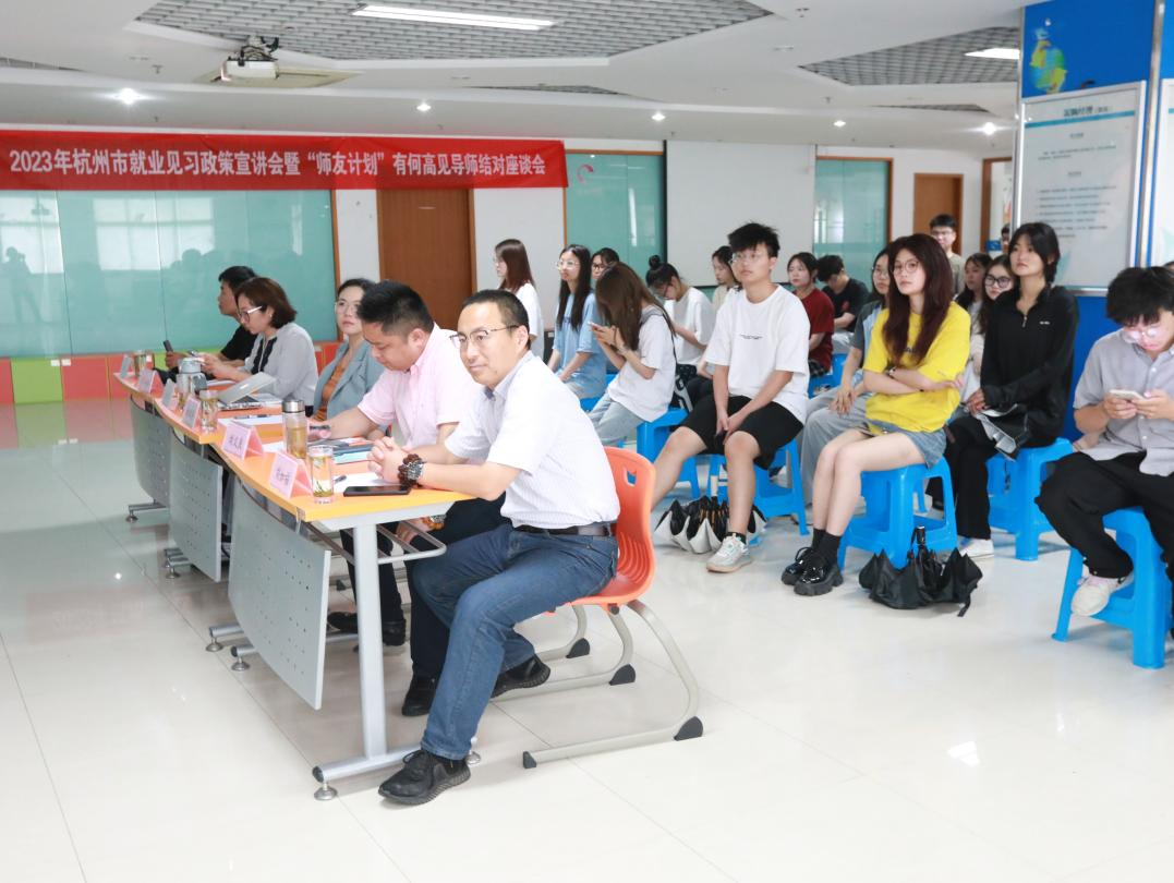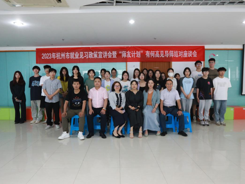举办“公共服务进校园”2023年杭州市就业见习政策宣讲会暨“师友计划”有何高见导师结对座谈会。