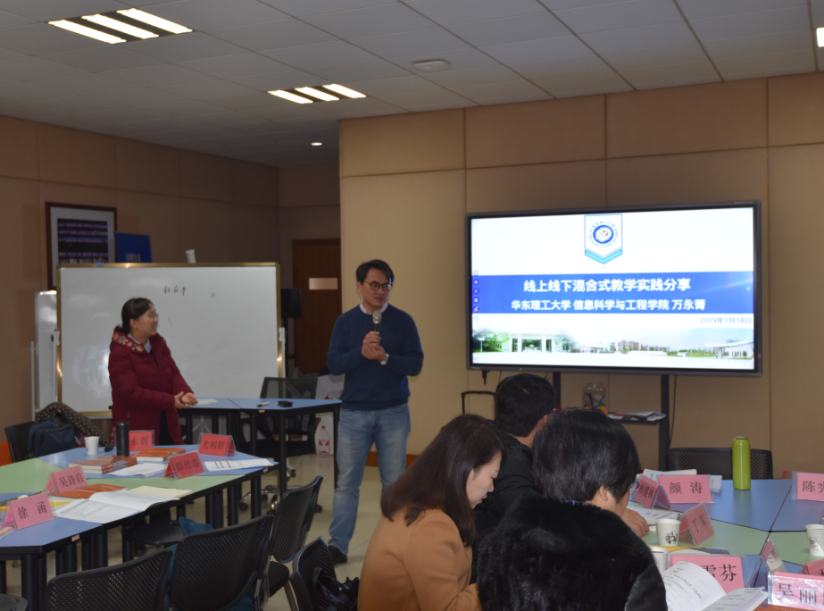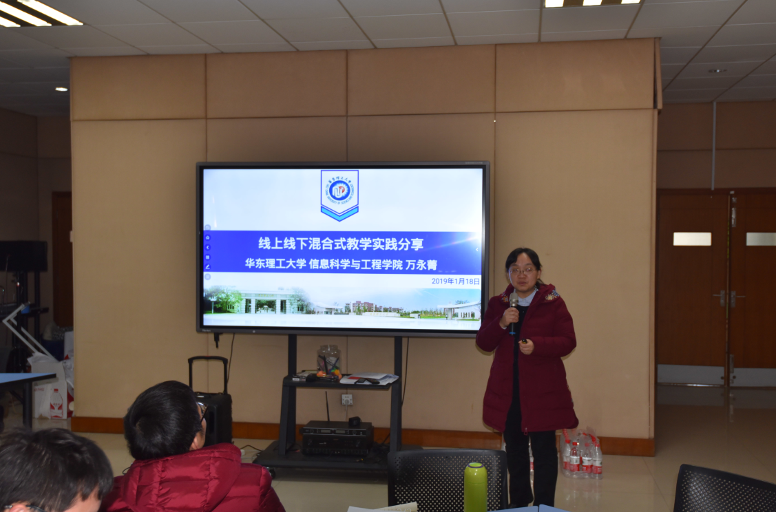 华东理工大学信息科学与工程国产视频 副院长万永菁受邀参与此次《创业基础》研讨会并与在场的课程任课教师们分享了自己线上线下混合式教学实践的经验。万院长主要从在线视频的设计、在线练习的精选、翻转课堂的互动交流、实践提高的实践项目设计四个方面介绍了自己课堂教学的经验,在讲解过程中,万院长还分享了自己的教学箴言:“精心备课是师德师风的体现,立德树人理念支撑起成功课堂”。