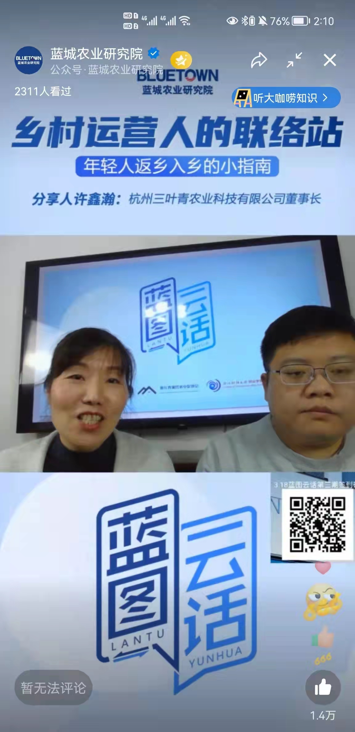 特别支持的蓝图云话第三期—走进三叶青中药现代农业园区顺利举行。本期直播的主题是走进三叶青中药现代农业园区,分享年轻人返乡入乡的小指南,由杭州三叶青农业科技有限公司董事长许鑫瀚为我们进行分享。